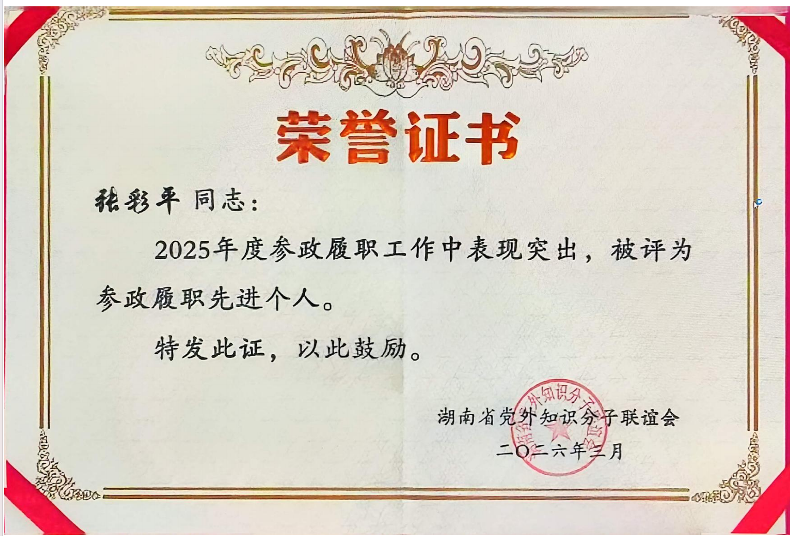 近日,湖南省党外知识分子联谊会印发通报,表彰2025年度参政履职先进个人,我校知联会会长、省政协常委张彩平教授光荣入选。此次表彰,既是对张彩平教授深耕专业、倾情履职的充分肯定,也是我校党外知识分子服务国家战略、助力地方发展的生动缩影。
